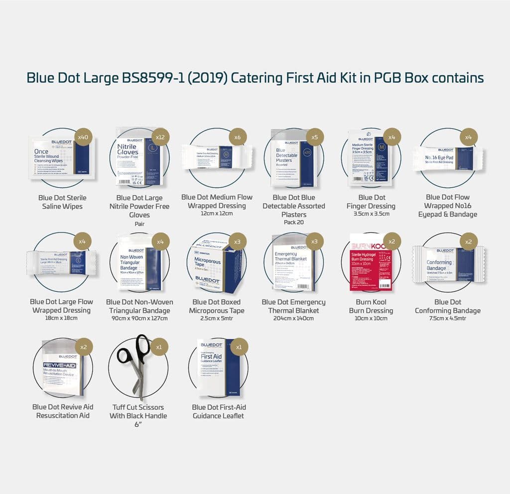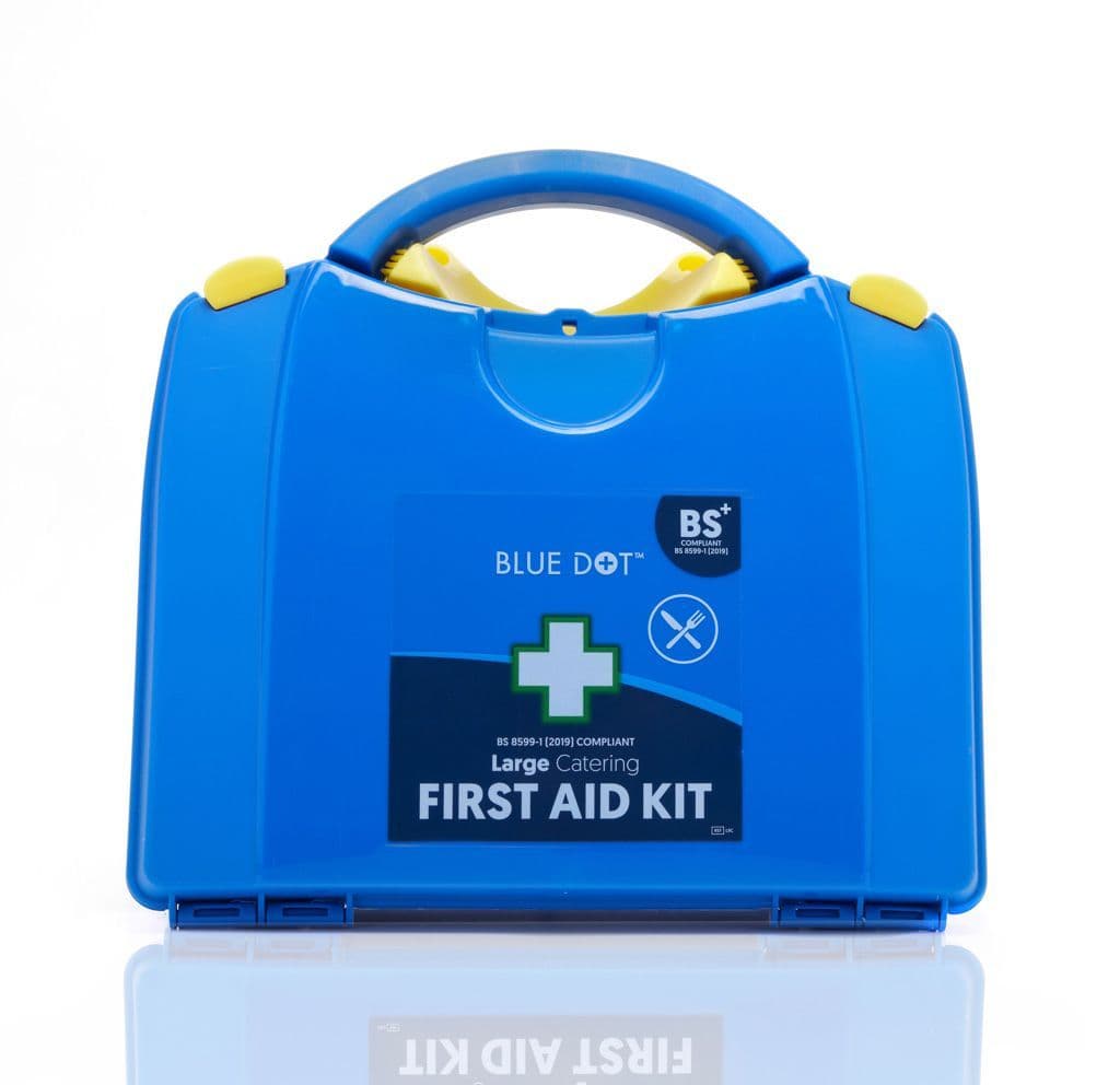 First Aid Kits Home / First Aid / First Aid Kits / Large Catering First Aid Kit BS 8599-1 (2019) Large Catering First Aid Kit BS 8599-1 (2019) Large Catering First Aid Kit BS 8599-1 (2019) £31.93 £38.32 (inc. VAT) BS 8599-1 (2019) compliant, catering-safe, wall-mountable, blue plasters, burn dressings, full kit Add to your Wish List Information Specifications Reviews Blue Dot BS 8599-1 (2019) Catering First Aid Kit The Blue Dot BS 8599-1 (2019) Catering First Aid Kit is specifically designed for food preparation areas, ensuring compliance with food safety regulations. Housed in a durable, wall-mountable blue box, this kit provides quick access to essential first aid supplies, making it an essential safety measure for catering businesses. It includes blue detectable plasters and specialist burn dressings, tailored for kitchen environments. Key Features: Compliant with BS 8599-1 (2019) Standards – Fully meets workplace first aid requirements. Robust, Wall-Mountable Case – Hard-wearing design for long-term use, with a large, easy-to-carry handle. Designed for Catering Environments – Contains blue detectable plasters for food safety compliance. Quick & Easy Access – The kit can be easily removed from the bracket for fast response in emergencies. Available in Small, Medium & Large – Suitable for various workplace sizes. Contents: 40 x Sterile Saline Wipes 12 x Large Nitrile Powder-Free Gloves (Pair) 6 x Medium Flow Wrapped Dressings (12cm x 12cm) 5 x Blue Detectable Assorted Plasters (Pack of 20) 4 x Large Flow Wrapped Dressings (18cm x 18cm) 4 x Non-Woven Triangular Bandages (90cm x 90cm x 127cm) 4 x Flow Wrapped No16 Eyepad & Bandage 4 x Finger Dressings (3.5cm x 3.5cm) 3 x Boxed Microporous Tape (2.5cm x 5m) 3 x Emergency Thermal Blankets (204cm x 140cm) 2 x Revive Aid Resuscitation Aids 2 x Burn Kool Burn Dressings (10cm x 10cm) 2 x Conforming Bandages (7.5cm x 4.5m) 1 x Tuff Cut Scissors (Small, 6") 1 x First Aid Guidance Leaflet This comprehensive catering first aid kit is ideal for restaurants, cafés, food production facilities, and catering businesses, ensuring compliance with food hygiene and workplace safety regulations. Height: 330mm Width: 110mm Length: 360mm Brand: Blue Dot™ Product Code: EQ000067 Weight: 1.3kg Not yet reviewed Write an online review and share your thoughts with other shoppers! Be the first to review this product