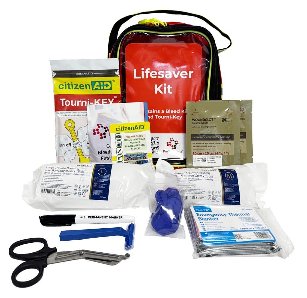 Trauma Kits Home / Trauma/ Emergencies / Trauma Kits / Lifesaver Kit with Tourni-Key - Red Lifesaver Kit with Tourni-Key - Red Lifesaver Kit with Tourni-Key - Red £85.00 £102.00 (inc. VAT) Compact design, Includes Tourni-Key, Trauma guide included, For fast, focused bleed control Add to your Wish List Information Specifications Reviews Essential Lifesaver Bleed Kit with Tourni-Key (Red) – Compact Emergency Trauma Kit Be equipped to handle life-threatening bleeding emergencies with this lightweight and compact Lifesaver Kit featuring the citizenAID® Tourni-Key Plus. Designed for simplicity, speed, and portability, this practical pouch is ideal for lone workers, travellers, vehicle storage, or low-risk environments where fast action is critical. Kit Contents: 2 x Woundclot Trauma Dressings (10cm x 10cm) – Advanced haemostatic dressings for rapid and effective blood control 1 x citizenAID® Tourni-Key Plus – A simple tool to turn a clothing item and triangular bandage into a functional tourniquet 1 x Blue Dot Large Trauma Dressing (15cm x 18cm) 1 x Blue Dot Medium Trauma Dressing (10cm x 18cm) 1 x Tuffcut Shears (15cm) – Cut through fabric and bandages quickly and safely 1 x Disposable Razor – Ideal for prepping skin for treatment or AED use 1 x Pair of Nitrile Gloves (Large) – Provides a hygienic barrier for responder and patient 1 x Emergency Foil Blanket – Helps retain body heat and prevent shock 1 x Trauma Guide – Offers essential instructions for immediate response 1 x citizenAID® Pocket Guide – Concise, clear emergency reference 1 x Indelible Marker Pen – Record important information during treatment Why Choose This Kit? Ultra-Compact Design – Small enough for bags, glove compartments, or desk drawers Specifically for Bleed Control – No unnecessary extras; focused tools for high-risk bleed response Personalisation Available – Bulk and branded options available upon request A smart, space-saving solution for anyone who needs fast access to bleed control essentials—without the bulk of a full trauma kit. Product Code: 8-206 Not yet reviewed Write an online review and share your thoughts with other shoppers! Be the first to review this product