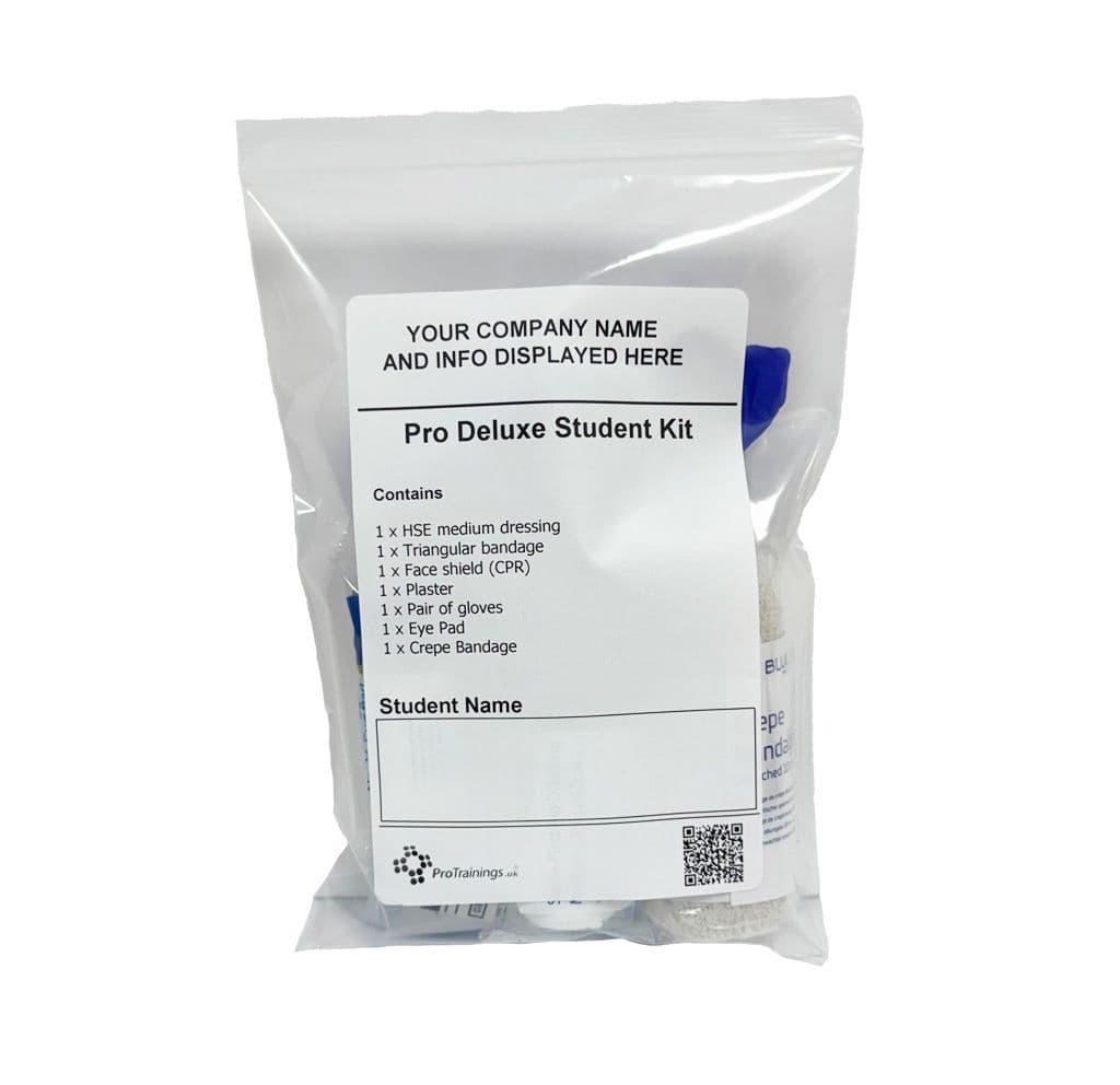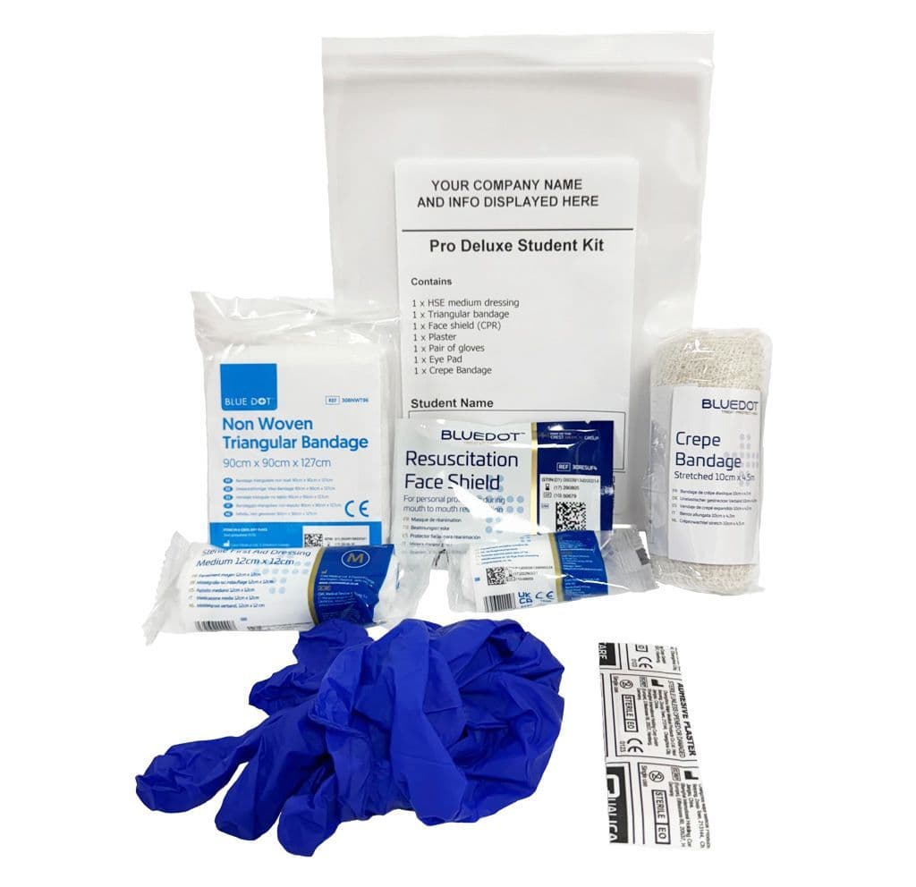 Student Dressing Packs Home / Training Equipment / Student Dressing Packs / Pro Deluxe Student Kit pack of 50 - Personalised Pro Deluxe Student Kit pack of 50 - Personalised Pro Deluxe Student Kit pack of 50 - Personalised £147.50 £177.00 (inc. VAT) Add to your Wish List Information Specifications Reviews Designed for First Aid at Work and Paediatric First Aid Courses. Provide your organisation's name, contact telephone and email/web address and it will be printed on the label for you. Contains 1 Pair of gloves 1 Crepe bandage 1 Triangular bandage 1 Eye pad dressing 1 HSE dressing 1 Plaster 1 CPR Face shield Product Code: 8-030 Not yet reviewed Write an online review and share your thoughts with other shoppers! Be the first to review this product